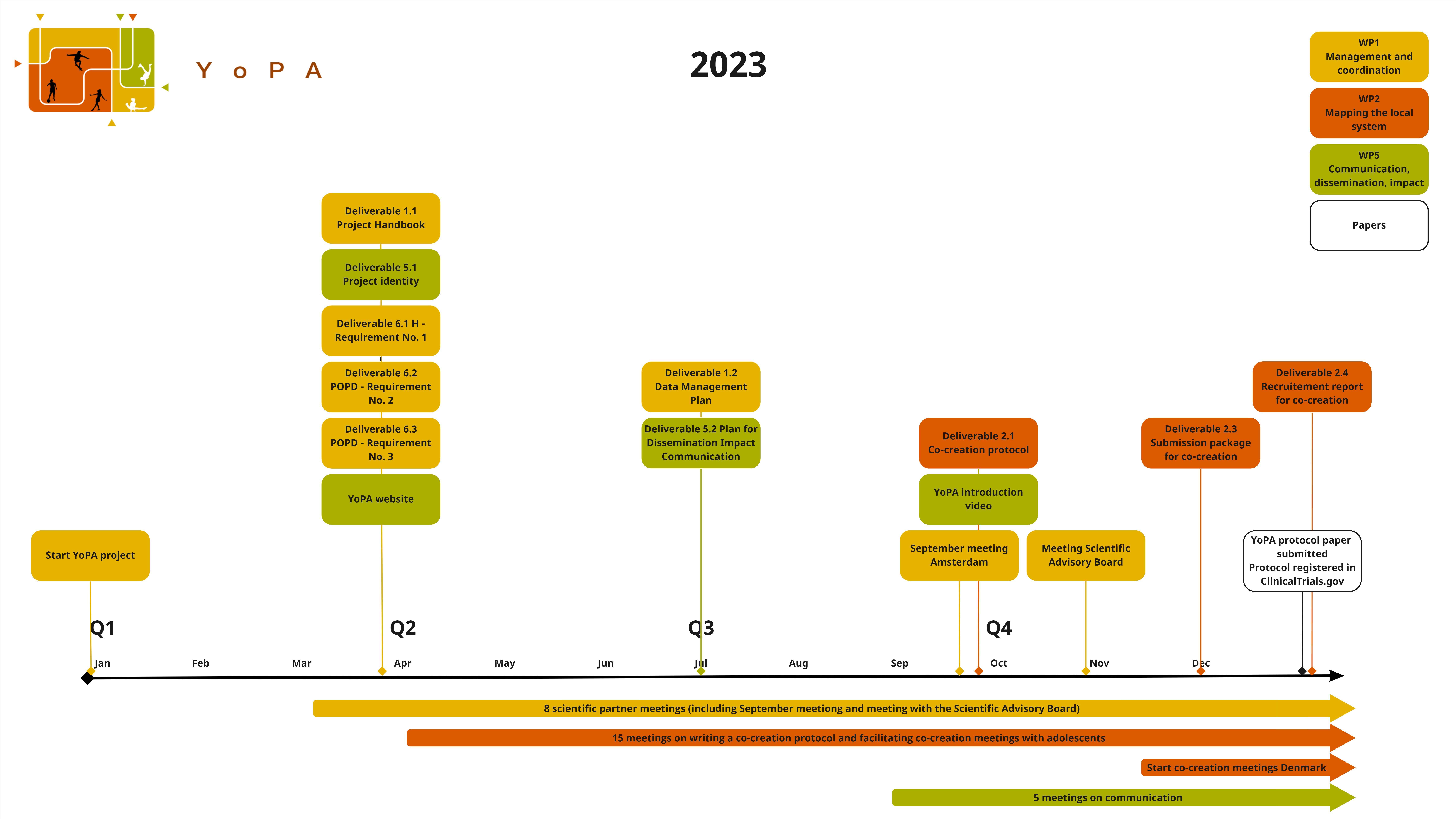 This is the YoPA’s 2023 timeline, which includes all the executed deliverables from Work Packages 1, 2 and 5, as well as other important milestones for the project: